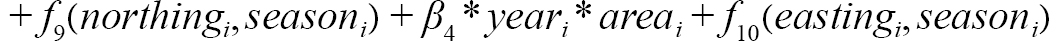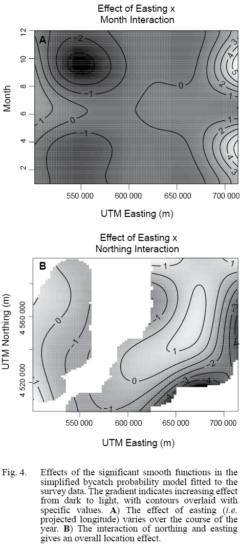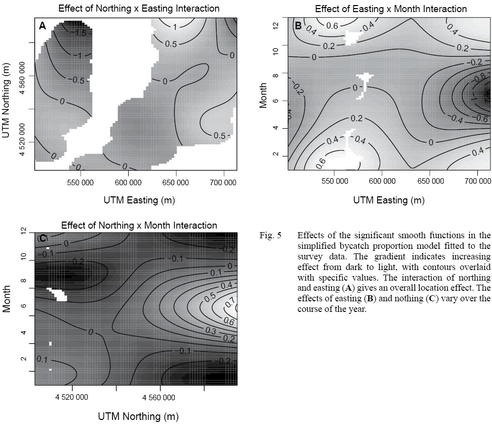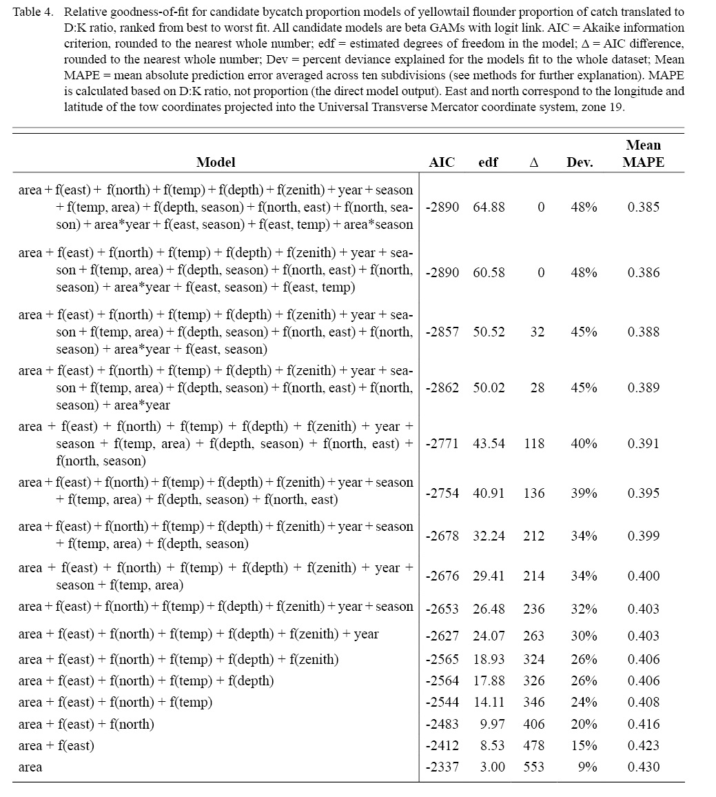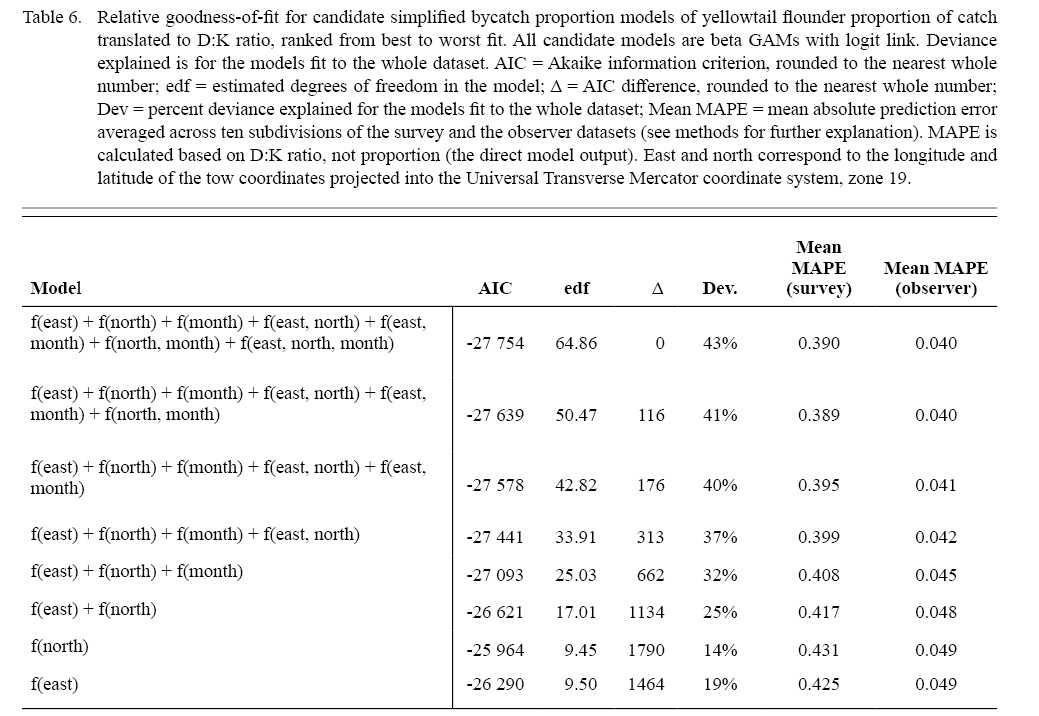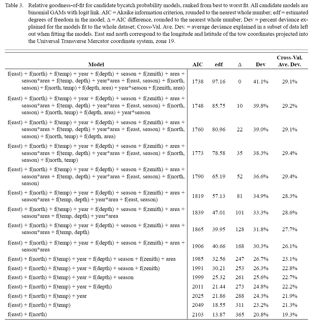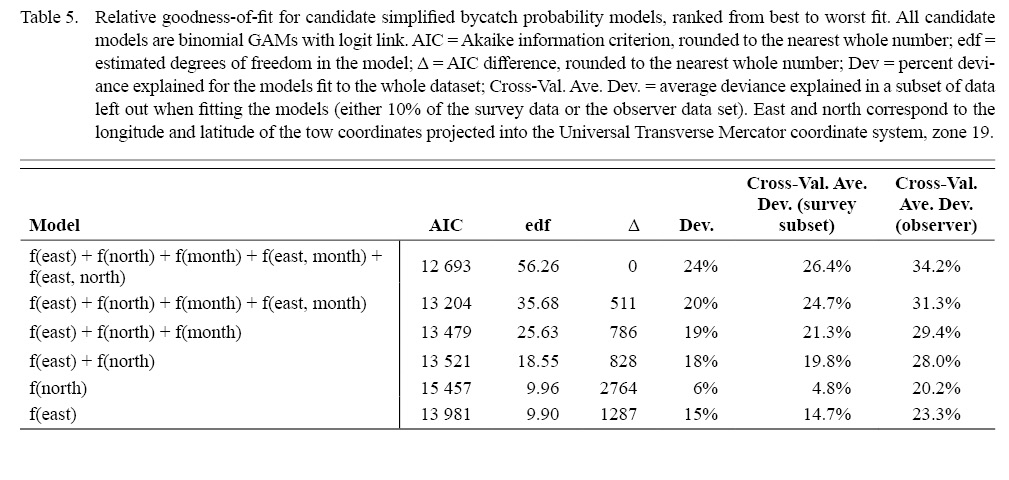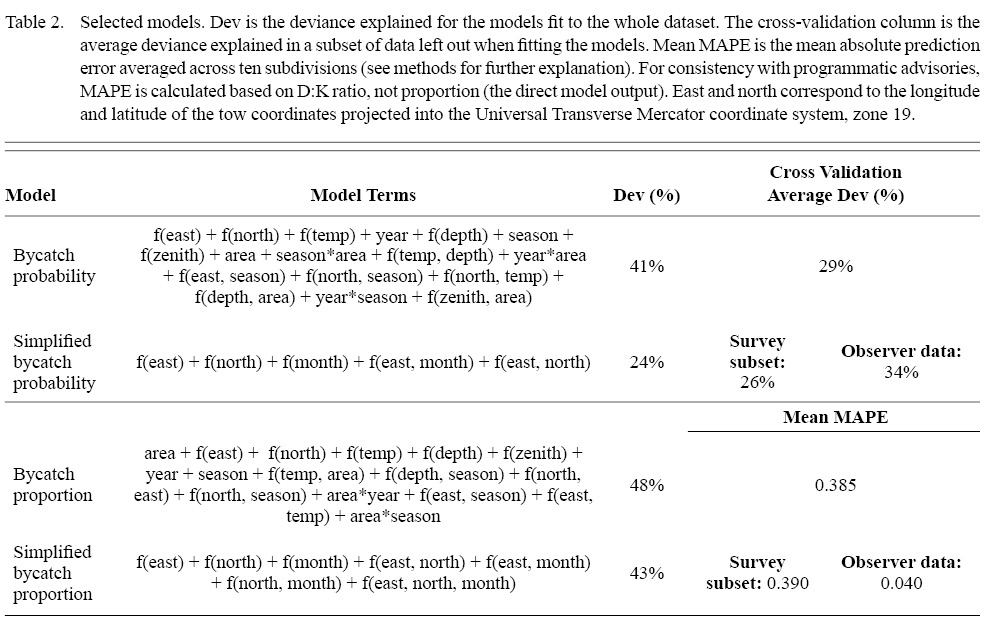 The purpose of developing simple models in addition to the complex models was to develop a useful tool for the bycatch avoidance program by using only data that is collected in the program. The ideal models combine simplicity of structure and data requirements with similar performance to the selected complex models. Each of the simple models includes only combinations of latitude, longitude, area, and month and their interactions. This is the simplest set of data requirements, and these factors may reflect underlying effects of other factors that were significant in the complex models. Statistically, relatively little is gained by including the additional environmental factors after the spatiotemporal component is accounted for, particularly in the conditional bycatch proportion models. Moreover, the numerous terms and especially interactions in the complex models make interpretation difficult.