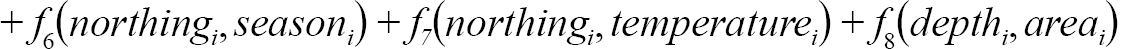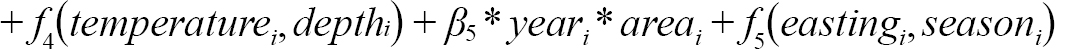 Similar to our results, Helser and Brodziak (1996), and Truesdell (2013) also found seasonal effects, whereas NEFMC (2013) and Smolowitz et al. (2012) considered month instead of season. Short seasonal migrations have been documented in tagging studies (Royce et al. , 1959; Lux, 1963; Cadrin and Westwood, 2004; Wood and Cadrin, 2013). Similar to NEFMC (2013) and Smolowitz et al.(2012), we found that Closed Area II had significantly greater bycatch probability than Closed Area I, and there was a significant interaction between area and year. DeLong and Collie (2004), Simpson and Walsh (2004), and NEFMC (2013) report effects of latitude and longitude. Similarly, we found that longitude had a significant positive effect, and although latitude did not have a significant main effect, there were significant interactions of latitude with temperature and season.