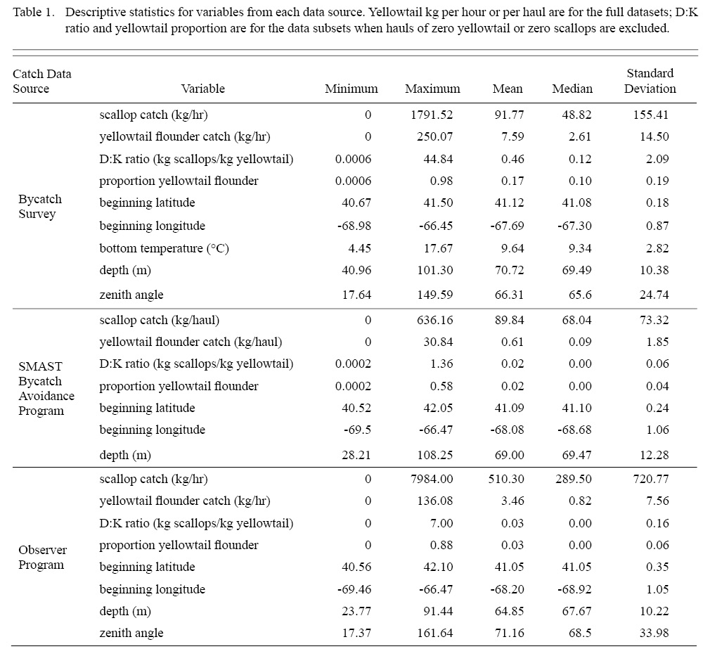 Probability of yellowtail flounder bycatch and bycatch proportions (yellowtail flounder weight divided by the total weight of yellowtail flounder plus scallop meats) were the response variables in modelling. We explored relationships of yellowtail flounder bycatch with a variety of environmental factors: tow location (management area, latitude and longitude), year, season, month, time of day, zenith angle, bottom temperature, depth, and sediment coarseness for each tow were potential explanatory variables for complex models (Table 1). Relatively simple models were explored for potential use in the bycatch avoidance program using variables limited to those that were available in the program data (em>i.e., latitude, longitude, month or season, and “area”: Nantucket Lightship Closed Area Access Area, Closed Area I Access Area, Closed Area II Access Area, open areas (Fig. 1)). Area was considered in addition to tow coordinates to capture the effect of differing management and fishing behaviour across these broad locations.