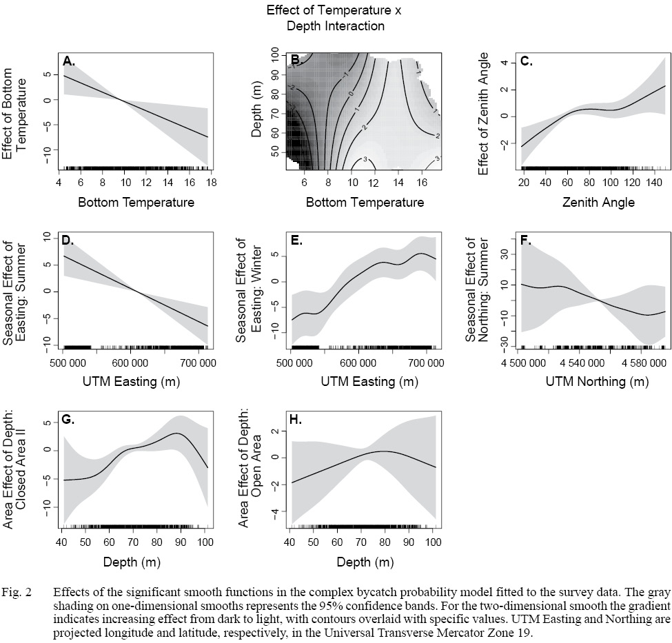 Bycatch probability decreased with increasing temperature (Fig. 2A–B) and increased as zenith angle increased from 20 to 60 degrees (Fig. 2C). In the summer, bycatch probability decreased at from west to east (Fig. 2D), and the pattern is reversed in the winter with probability increasing from west to east (Fig. 2E). Bycatch probability decreased as latitude increased in the summer months (Fig. 2F). In Closed Area II as well as the open area to the southwest of Closed Area II, bycatch probability decreased at depths beyond approximately 90 m (Fig. 2G–H).
