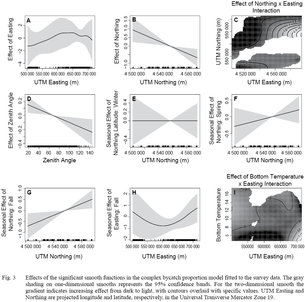 The selected simple model of conditional bycatch proportion includes longitude, latitude, month, and two- and three-way interactions and fit the data relatively well (Tables 2 and 6). Conditional bycatch proportion peaked at intermediate latitude, and the effects of latitude and longitude changed seasonally (Fig. 5).