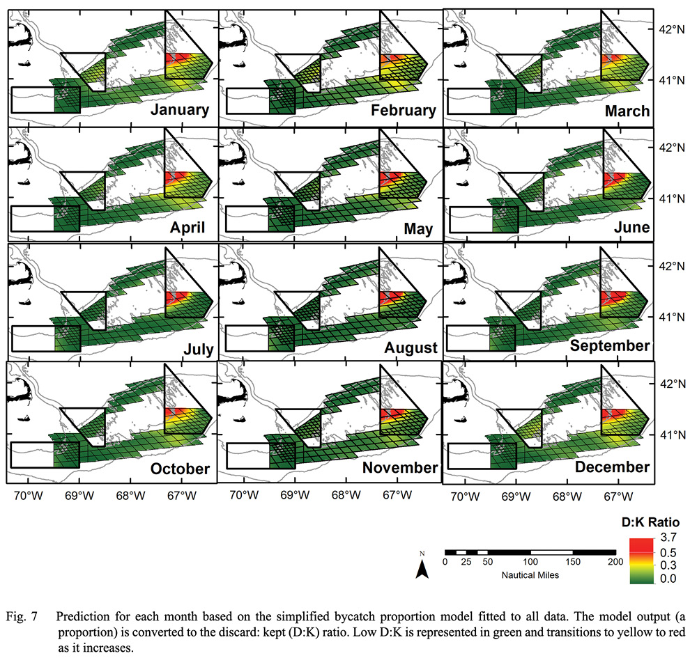 Predicted conditional bycatch proportions were greatest in the northwest corner of the Closed Area II access area (Fig. 7). Conditional bycatch proportion in the southern open area was greatest during the early part of the year and decreased around June through August and increased again through the end of the year.