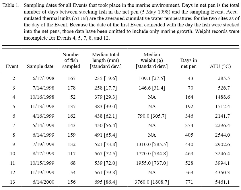 Scale growth rates and circulus deposition rates were averaged among sampling Events across the duration of the study and among stocks and sites to ascertain the presence of any relationships between these rates and either time or water temperature. Growth and circulus deposition were calculated between Events, so there are a total of 12 growth/ circulus deposition intervals among the 13 sampling Events. However, data from Event 1 were omitted because Event 1 took place in the freshwater rearing facilities, leaving a total of 11 growth/circulus deposition intervals for the analysis. Using these results we also calculated the number of days required for a single scale circulus to form.