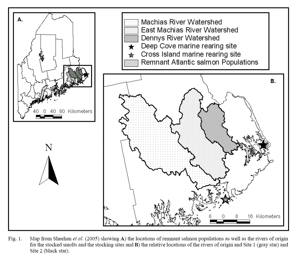 The field portion of this project was initiated in May 1998 when 6000 1+ Atlantic salmon smolts representing three rivers of origin were stocked into two marine net pen rearing facilities off the coast of Maine. Smolts originated from broodstock that were taken from the Dennys, East Machias, and Machias Rivers. The stocks from these rivers are all part of the Gulf of Maine Distinct Population Segment (GOM DPS), which was listed as Endangered under the Endangered Species Act (Endangered and Threatened Species, 2009) due to continued declines (National Research Council, 2004). The original broodstock were brought into captivity as parr, raised to maturity, and spawned at Craig Brook National Fish Hatchery in East Orland, ME during November 1996. Two thousand smolts from each stock were randomly chosen to be placed in net pens at either Site 1 or 2 (Cross Island or Deep Cove, see Sheehan et al. 2005 for more details [Fig. 1]) on 5 May 1998. The selected smolts were randomly divided between the two Sites, for a total of 3 000 smolts in each net pen (Sheehan et al., 2005). While they were in the net pen the fish were fed to satiation, per industry standards (Sheehan et al., 2005).