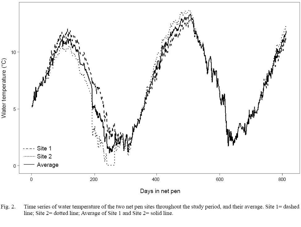 A total of 1 525 fish among all stocks and net pen sites was sampled over the duration of the project. The difference in mean water temperature between Site 1 and Site 2 was only 0.15°C (Site 1=7.45°C, Site 2=7.6°C). Therefore, the temperatures from the two sites were averaged, and the resulting temperature time series was used for all further analyses (Fig. 2). Additionally, two large gaps in temperature data from Site 2 made it impossible to calculate reliable scale growth rates or circulus deposition rates on a pen-specific basis
