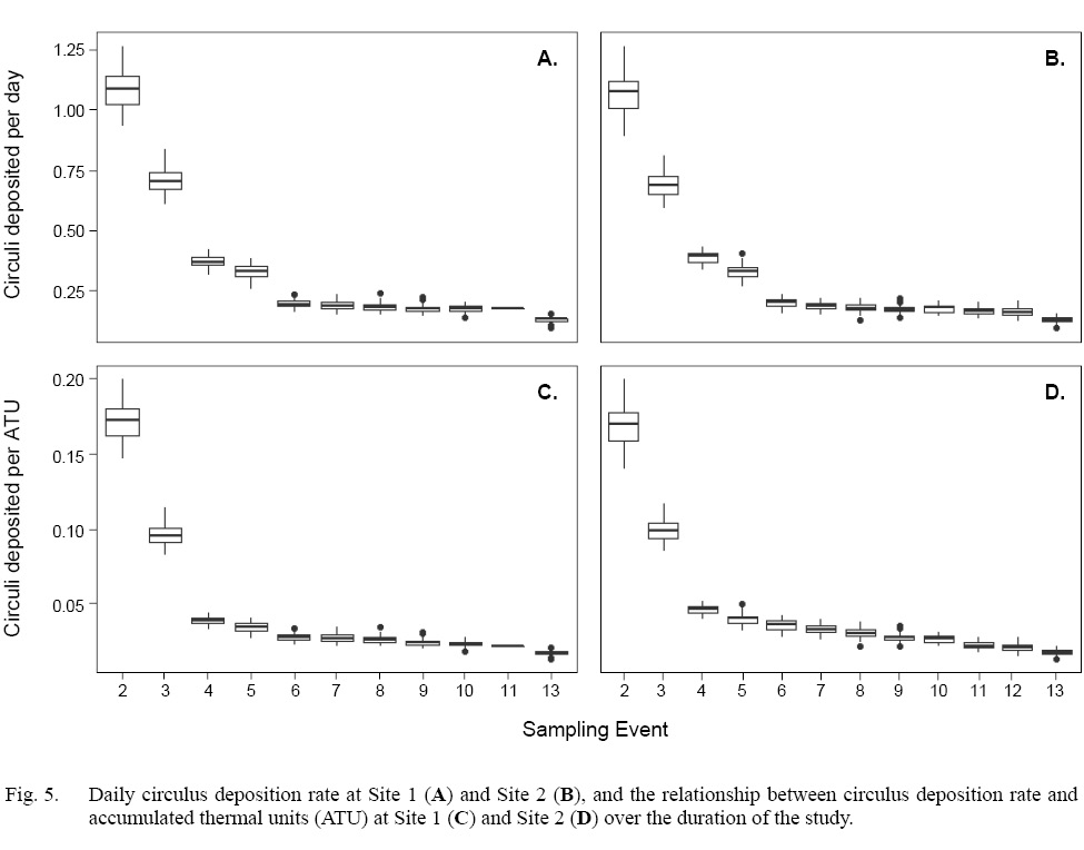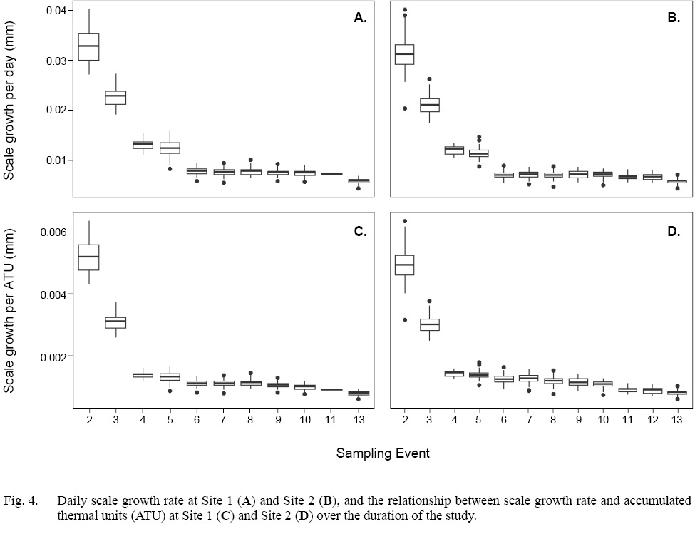 When scale circulus deposition rate was measured on a daily interval, each circulus required an average of 2.7 days to form at Site 1, with a range of 0.79-10.4 days. At Site 2, a single circulus formed on average every 3 days, with a range of 0.79–12 days. When considered relative to water temperature, a single circulus was deposited when a fish had experienced 5–75.5 ATU, with a mean of 19 ATU per circulus at Site 1. The temperature experience required for a single circulus to form on fish at Site 2 was similar, with an average of 20.5 ATU and a range of 5.3–82 ATU. The highest circulus deposition rates relative to both time and ATUs occurred between entrance to the marine environment and Event 2, the first marine sampling Event, while the lowest rates occurred among the final Events of the study.