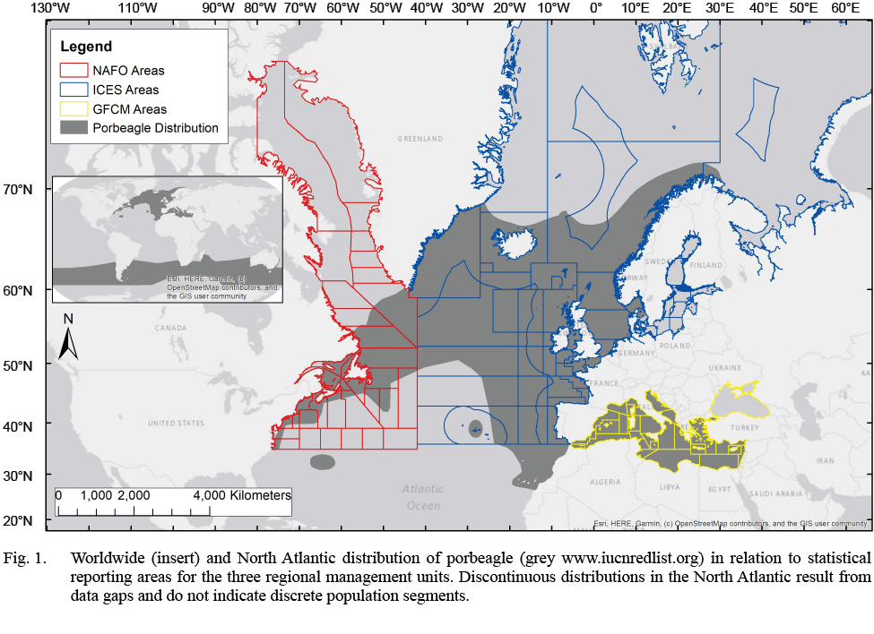 Best practices in stock identification involve an interdisciplinary synthesis of all available information to determine the most plausible paradigms of population structure in which information from different approaches is integrated conceptually and geographically (Begg, 2004; Cadrin et al., 2014). Information on distribution, movement, and geographic variation from advanced technologies can be reconciled with previous information from traditional methods to define spatial population structure. Considering all available information on life history, genetics, and movement of porbeagle in the North Atlantic, there appears to be a single genetic population of porbeagle in the Northern hemisphere, with a low frequency of transatlantic movements. However, low movement rates and some phenotypic differences between the Northwest Atlantic and the Northeast Atlantic suggest two semi-distinct stocks that are demographically independent on ecological timescales. Therefore, the U.S. definition of a single distinct population segment in the North Atlantic (Curtis et al., 2016) is consistent with the inference of a single genetic population. The Northeast Atlantic and Mediterranean management units defined by ICES/ICCAT, GFCM, CITES, and IUCN may not reflect the single biological population in the North Atlantic but may be appropriate for stock assessment and fishery management because of low mixing rates with the Northwest Atlantic areas. Similarly, the NAFO and Canadian definition of a Northwest Atlantic porbeagle stock (e.g., Campana and Gibson 2008; Campana et al., 2012) may be appropriate because of low mixing rates with the Northeast Atlantic.