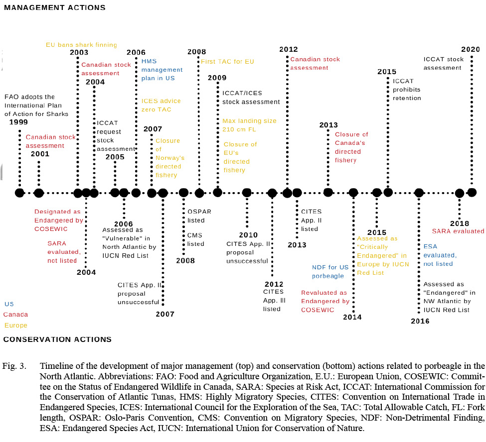 As is typical of highly migratory species management, there are multiple national and international organizations, countries, and regions that take part in fishery management and conservation of porbeagle (Table 1). The International Council for the Exploration of the Sea (ICES) provides management advice on porbeagle fisheries in the Northeast Atlantic (excluding the Mediterranean), whereas the International Commission for the Conservation of Atlantic Tunas (ICCAT) collects data, reports annual catches, conducts stock assessments, and provides advice on tuna and tuna-like fisheries where porbeagle are caught in the entire North Atlantic and Mediterranean. The Northwest Atlantic Fisheries Organization (NAFO), a Regional Fisheries Management Organization (RFMO), is not regularly involved in the management of Northwest Atlantic porbeagle fisheries but has contributed with advice upon request in the past (Campana and Gibson, 2008). The Canada Department of Fisheries and Oceans (DFO) manages porbeagle fisheries in Canadian waters, and the U.S. National Marine Fisheries Service (NMFS) manages porbeagle fisheries in the United States. Northeast Atlantic fisheries are managed by the European Common Fisheries Policy in the European Union (E.U.) and by individual non-EU countries. The Northeast Atlantic Fisheries Commission (NEAFC) is the RFMO for the Northeast Atlantic, and the General Fisheries Commission for the Mediterranean (GFCM) is the RFMO for the Mediterranean. In addition to these management organizations, there are several conservation organizations and treaties that are involved in the management and conservation of highly migratory sharks in the North Atlantic, and several nations have independent mandates for species conservation. There is presently little collaboration among management organizations, conservation organizations, and countries within regional organizations, and fisheries management varies greatly among European countries and between the U.S. and Canada (Campana, 2016; Cameron et al., 2019). There are several examples in the last 20 years where management advice, management actions, and conservation actions for the same stocks have been uncoordinated and, in some cases, contradicting (Fig. 3).