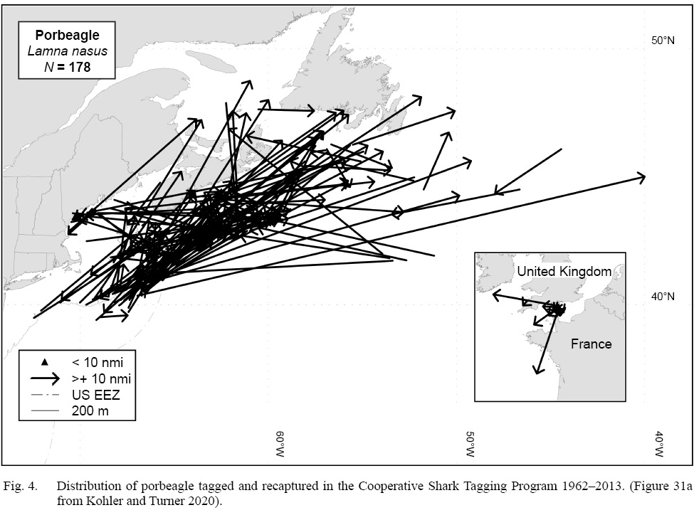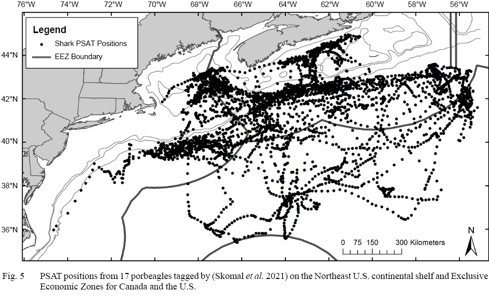 Pop-up satellite archival transmitting (PSAT) tags have been used to investigate migratory routes and habitat preferences of porbeagle in the Northwest Atlantic. PSATs attached to 17 porbeagles on Georges Bank showed minimum linear movements ranging from 937 to 3310 km over track durations of 120 to 360 days; all of the sharks remained in the western North Atlantic from the Gulf of Maine, the Scotian Shelf, on George's Bank, and in the deep, oceanic waters off the continental shelf along the edge of, and within, the Gulf Stream (Skomal et al., 2021). The results indicated broad, seasonally-dependent vertical and horizontal movements of porbeagles in the Northwest Atlantic with most of their time (97%) in temperatures ranging from 6–20°C (Skomal et al., 2021). This study also showed that porbeagles move routinely from the U.S. Exclusive Economic Zone (EEZ) into Canadian waters and that they spend a significant amount of their time in the high seas outside of any EEZ (Kohler and Turner, 2020; Skomal et al., 2021; Fig. 5).