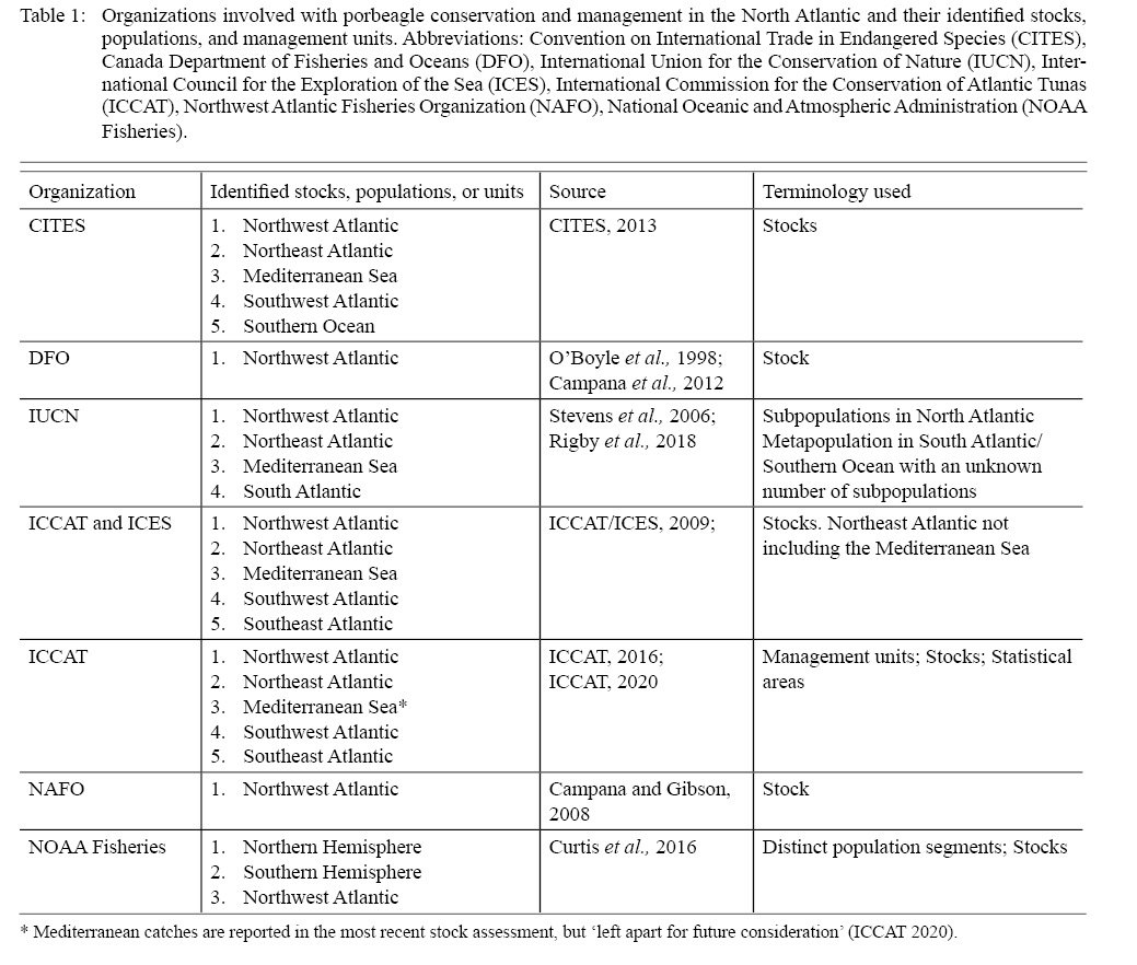 Different stock definitions and boundaries among fishery management or conservation organizations can hinder the success of fishery management and the ability to achieve conservation goals. Therefore, refining the terminology and finding agreement on stock boundaries among parties for the North Atlantic porbeagle is expected to improve collaboration among parties and increase the effectiveness of fishery management, the performance of stock assessments and conservation assessments of this overexploited, highly migratory species. The objectives of this study were to 1) provide a comprehensive review of the information available on North Atlantic porbeagle stock structure using diverse stock identification approaches; 2) evaluate if current stock delineations reflect biological populations; and 3) consider the extent to which the misalignment of stock identification could impact stock assessments, conservation assessments, and management.
