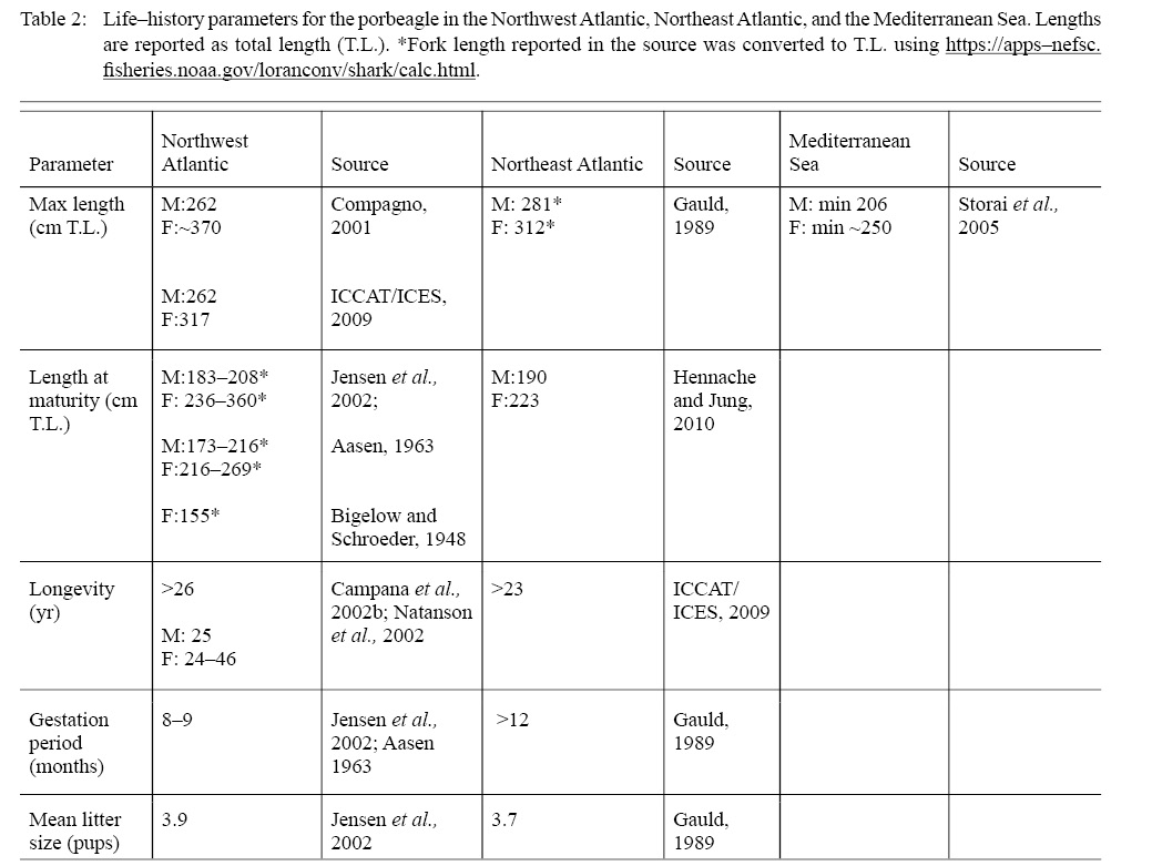 Another metric that stock assessments rely on is size or age at maturity. The length at maturity for porbeagles in the Northwest Atlantic ranges from 173 to 216 cm total length (T.L.) for males (Aasen 1963; Jensen et al., 2002) and 155 to 269 cm T.L. for females (Bigelow and Schroeder, 1948; Aasen 1963; Jensen et al., 2002). The estimated size at 50% maturity of Canadian and U.S. porbeagle mature is 198 cm T.L. and 246 cm T.L. for males and females, respectively (Jensen et al., 2002). Based on fewer observations, the porbeagle in the Northeast Atlantic matures at smaller sizes and reaches a smaller maximum size than those in the west (Table 2), and length at 50% maturity is 191 cm T.L. for males and 226 cm T.L. for females (Hennache and Jung, 2010). Age at maturity for porbeagle in the Northwest Atlantic is 13 years for females and 8 years for males (Jensen et al., 2002; Natanson et al., 2002), but there are no age estimates for comparison in the Northeast Atlantic.