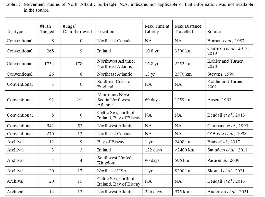 Tagging studies confirm that porbeagles have large home ranges and are capable of long-distance migrations. Porbeagle distribution in the Northeast Atlantic ranges at least from the North Sea to Morocco and south of the entrance to the Mediterranean Sea, past the current management unit for the Northeast Atlantic porbeagle. Distribution in the Northwest Atlantic ranges from Canada to the Sargasso Sea, with several studies observing porbeagle movements between the U.S. and Canada. Information from tagging suggests a low rate of movement between the northeast and northwest Atlantic, with one porbeagle tagged in Irish waters and recaptured on the Grand Banks ten years later (Cameron et al., 2018) from a total of 346 conventional tag recaptures (ICES, 2022), and location estimates from several archival tag deployments that indicate movement across the ICES-NAFO boundary (42°W) from porbeagle tagged in the Bay of Biscay (ICES, 2022) and off the British Isles (ICES, 2022). There are no observed movements between the Northeast Atlantic and Mediterranean, and a thermal habitat barrier may limit movement between those areas (ICES, 2022). To further investigate the mixing potential between the Northeast Atlantic and the Mediterranean, fine-scale movement patterns between the waters outside of Northwest Africa and the Mediterranean should be investigated.