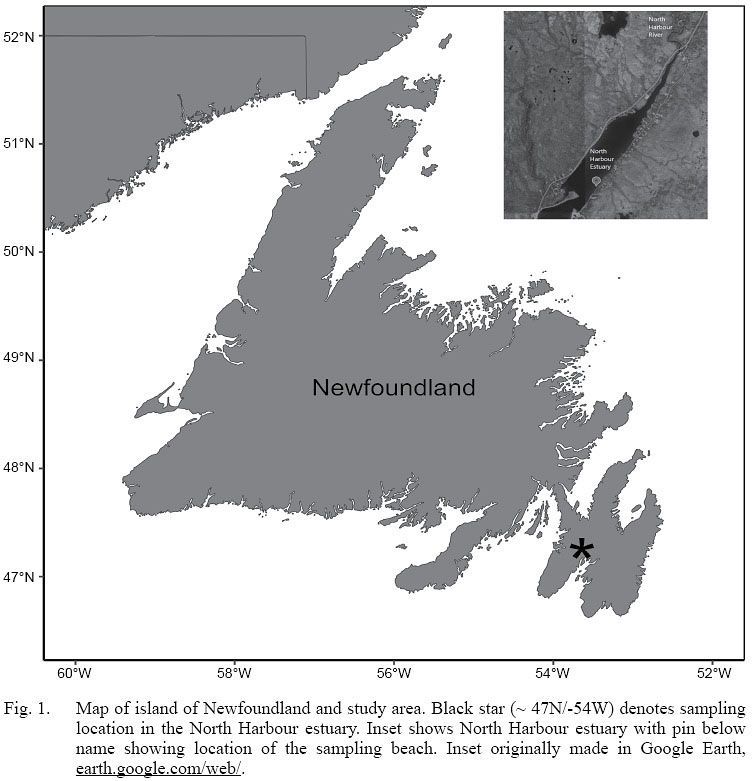 Our study site is the North Harbour estuary in St. Mary’s Bay, Newfoundland (Fig. 1). The estuary is formed where the North Harbour river empties into St. Mary’s Bay. The estuary widens as it extends seaward, but just south of our study beach a spit of land intrudes into the estuary and creates a calm, sheltered embayment. The shoreline consists of small rock and cobble, and there are eelgrass beds located just below the low water mark. From our observations, the estuary itself is overall shallow (i.e. < 10 m depth) and features muddy bottom in the mid portions of it. Salmonids, scallops, and rock crab are among the most common species found in the area.