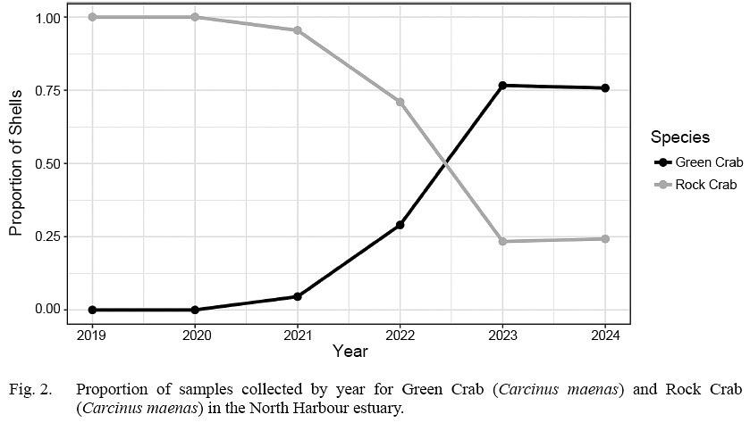 Invasive green crab have substantially altered composition of the crab community in the North Harbour estuary in recent years, with a proportional switch in measured species composition from 0 to 0.75 within three years (2021–2023) of being detected. However, given the non-systematic nature of our collection design and inability to examine absolute abundances of crab, we cannot determine the extent to which this switch in ratio represents an increase in abundance of green crab versus a decrease in rock crab abundance.