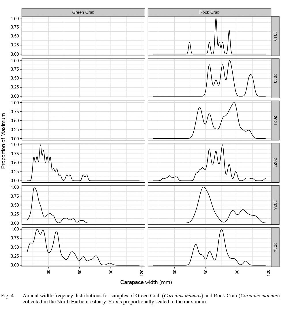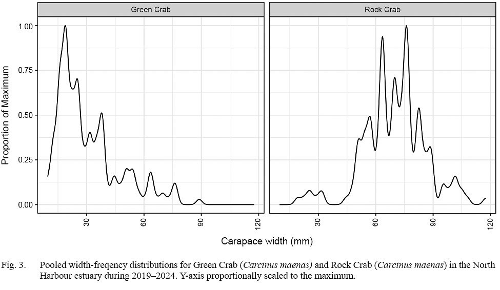 The majority of green crab collected were below 45 mm CW (Fig. 3), with a primary concentration ranging about 20–25 mm CW present in all three years of collections. The population structure appeared to broaden in 2024, with a secondary concentration centred near 38 mm CW and increasing prominence in concentrations of larger crab near 52 and 75 mm CW (Fig. 4).