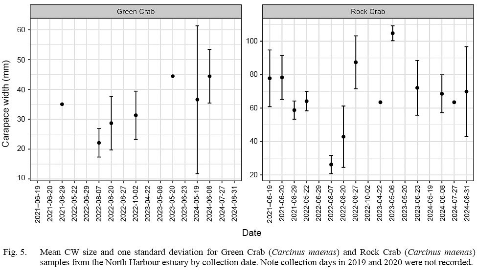 Mean sizes of rock crab in individual sampling events varied without trend over the study period while mean sizes of green crab systematically increased, doubling from 22.1 mm CW on Aug. 7, 2022 to 44.5 mm CW on June 8, 2024 (Fig. 5).
