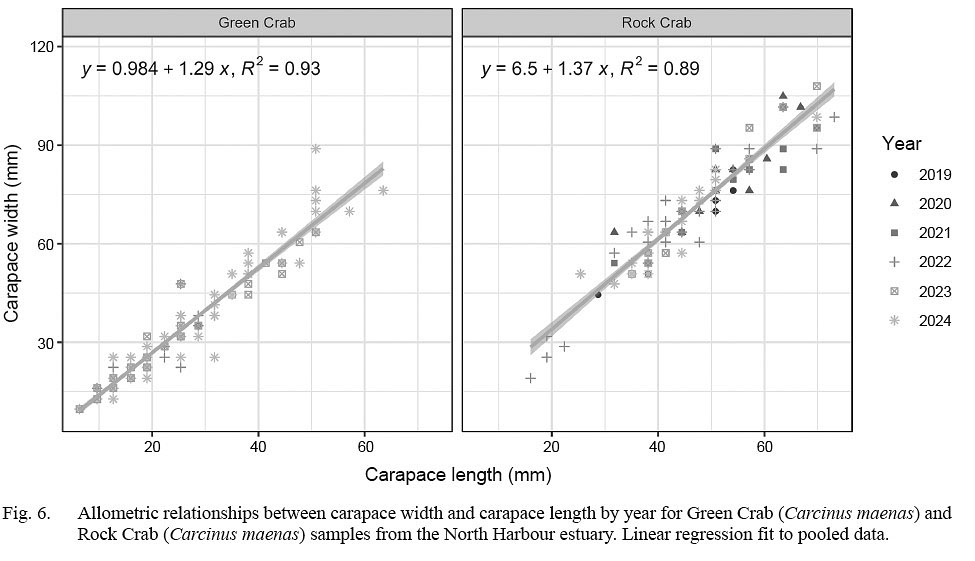 If patterns held, the dominant 20–25 mm CW concentration we observed in all three years of our samples would be expected to be crab in their second year of life. By extension, the secondary and higher level concentrations observed in 2024 would be expected to be both older crab and those large enough to be sexually mature. Like many crab species, female green crab molt before mating, thus lack of fresh shells in beach samples in July-August would suggest mating is not taking place in late summer or early fall. This would align with observations of Best et al. (2017) who determined females in Placentia Bay spawned during June–July, with August and September representing a period when recovery of spent females is common. The reproductive cycle was thought to be annual, with copulation typical in spring. Intuitively, our observations would appear to suggest that the North Harbour estuary population of green crab has similar life history dynamics as those in neighbouring Placentia Bay. Indeed, green crab found near the mouth of St. Mary’s Bay have been determined to be genetically akin to those in Placentia Bay (Lehnert et al., 2018).