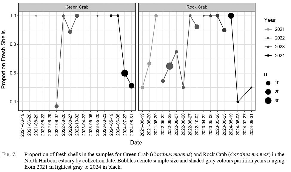 The proportion of fresh shells in the rock crab samples were at 1 in August in 2021 and 2022 and May in 2023 and 2024, suggesting molting periods at about these months (Fig. 7). The proportion of fresh shells in the green crab samples was near one in most collection periods, suggesting frequent molting. However, there were exceptions to high proportions of fresh shells in green crab samples during collections in August 2022 and July and August in 2024. This suggests a paucity of molting in mid- to late summer in the green crab.