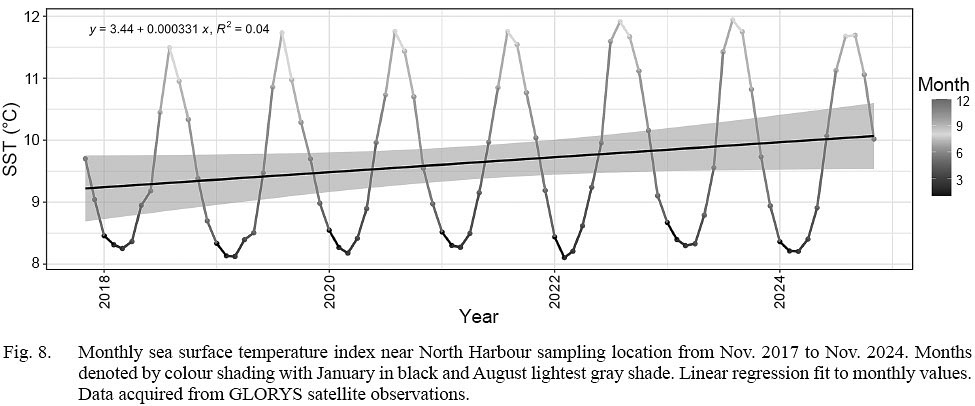 Sea surface temperatures consistently peaked in August and were lowest in March preceding and throughout the study period (Fig. 8). The temperature trend in the linear regression gradually increased at a rate of 0.00033 degrees per month (slope=0.000331) over the study period. The initial Nov. 2017 estimate of 9.75°C was 0.25°C below the terminal Nov. 2024 estimate of 10°C.