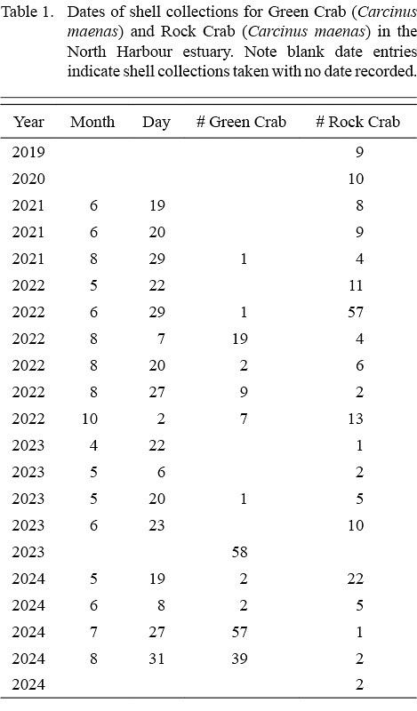 We continued collecting and measuring rock crab shells in the same fashion on opportunistic trips to the beach over the 2020–2024 period (Table 1), standardizing the area covered by limiting collections to a portion of the beach confined by landmarks at both ends. In 2021, the first green crab shell was found on the beach, thus we expanded our collections and measurements to green crab, with all measurements taken in the same way as for the rock crab.
