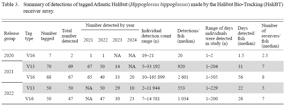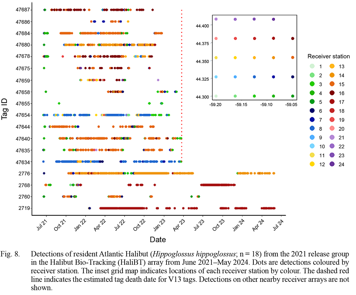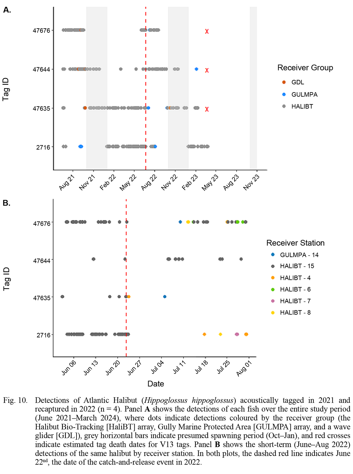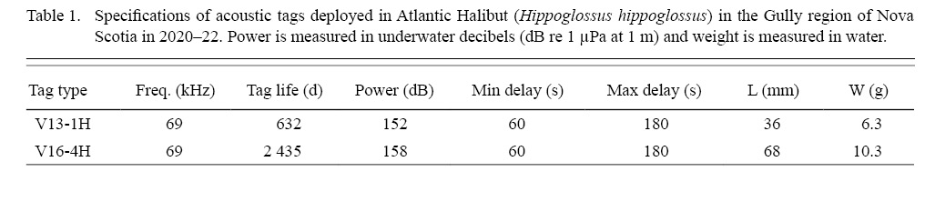 Bateman, E.M.T., Harper, D.L. , Byrne, T., Comeau, A., den Heyer, C.E., and Stokesbury, M.J.W. 2025. Movement and behaviour of Atlantic Halibut (Hippoglossus hippoglossus) in a juvenile hotspot detected by a passive moored acoustic receiver grid and active wave gliders. J. Northw. Atl. Fish. Sci., 56: 11–29. https://doi.org/10.2960/J.v56.m753