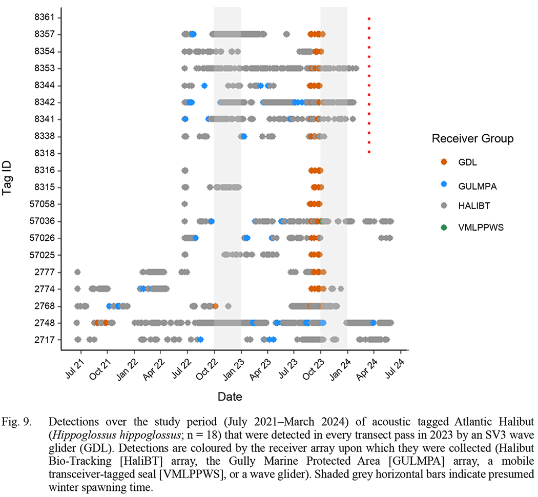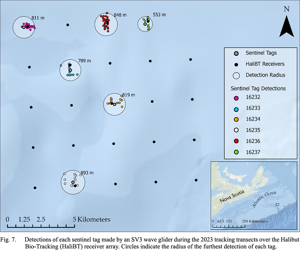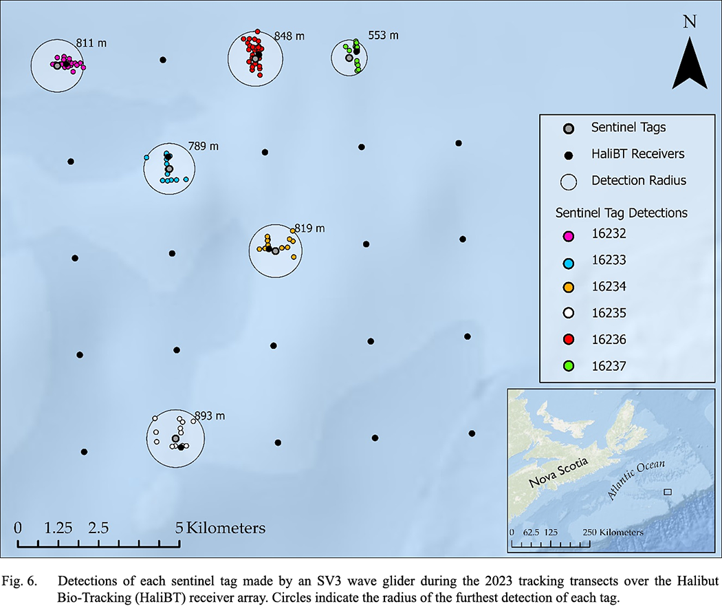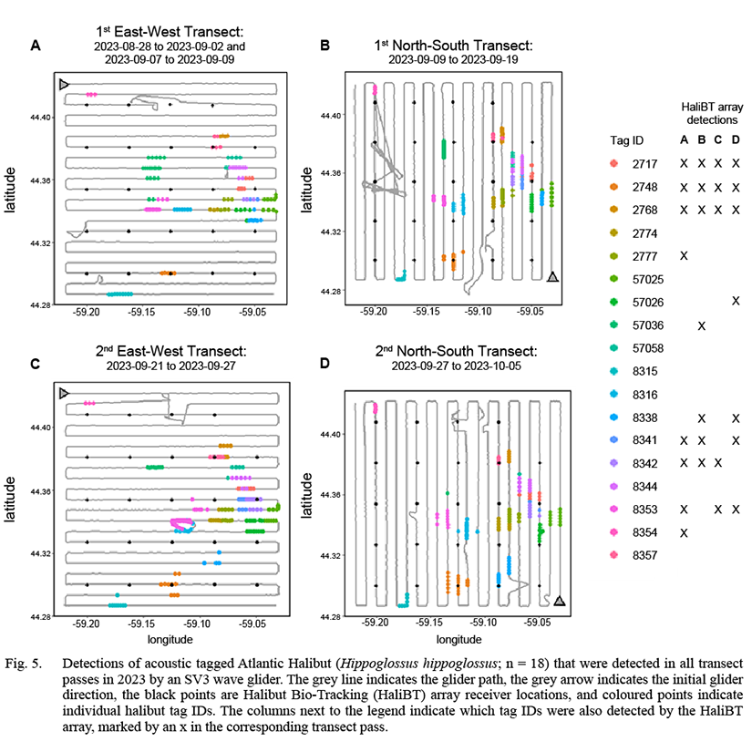 Several key knowledge gaps surrounding Atlantic Halibut movement remain, because while informative, these prior methods of tagging have limitations. Conventional tagging only reveals the net movement of a halibut between two points and is limited to areas and times where the fishery operates. Satellite tagging has so far occurred only on adult halibut large enough to support the large, cumbersome tags, therefore only representing the commercially exploitable size class (> 81 cm). Furthermore, satellite tags are restricted to short deployment lengths, so they are not well suited to monitor multi-year site fidelity. This project was established to address these knowledge gaps and was the first to track Atlantic Halibut (hereafter “halibut”) using acoustic telemetry in Canada. Acoustic tags are much smaller than satellite tags with long battery life spanning up to a decade. Tracking challenges included setting up acoustic monitoring infrastructure in deep, borderless habitats and contending with the diverse and wide-ranging migratory behaviours of halibut that are not well established. To deal with these challenges, a large, non-overlapping offshore receiver grid was deployed in an important juvenile halibut hotspot to provide a consistent measure of presence and residency over a large area. The extent of our monitoring capability was expanded through a collaboration with the Ocean Tracking Network (OTN; O’Dor and Stokesbury, 2009) which allowed us to detect halibut migration and dispersal beyond our study site. We paired this stationary grid with autonomous wave glider tracking to assess the efficacy of active tracking for future halibut telemetry projects in regions with or without moored receivers. In this paper, we investigate 1) the efficiency of our open-ocean grid array, 2) the movement and behaviours of tagged halibut within the array, and 3) a comparative assessment using mobile glider-based tracking for monitoring halibut.