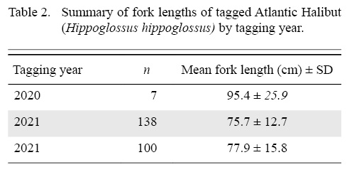 Fork lengths of tagged halibut ranged from 50 cm to 141 cm and the mean varied by tagging year (Table 2).