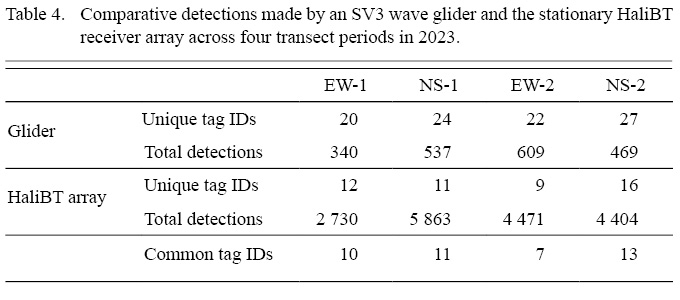 Autonomous wave gliders are not only able to remotely offload data from offshore receivers but can also act as mobile tracking platforms. We found that gliders were able to detect more tagged halibut in the array than the stationary receivers in the same time frame but were unable to determine long-term nuances in halibut behaviour. By presenting the successes and challenges of our monitoring methods, we hope to inform future telemetry research, particularly of halibut and other offshore species.