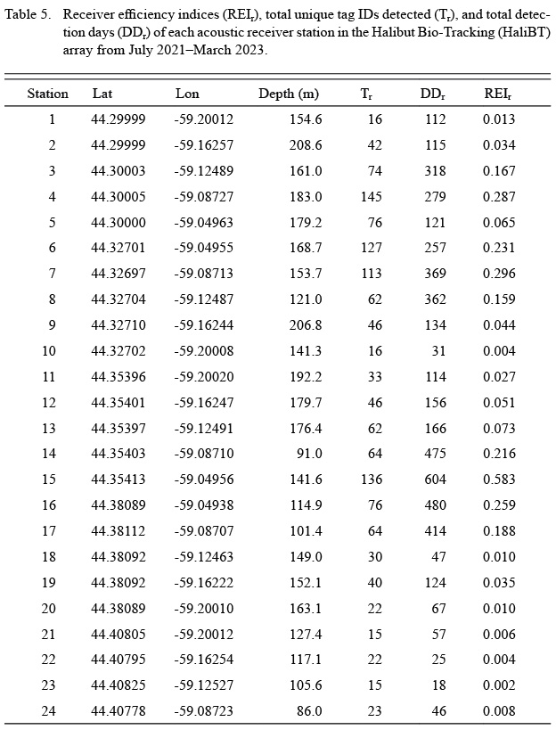 REI values were highest in the eastern side of the array, with station 15 (Lat 44.35413, Long -59.04956; 142 m depth; Fig. 6) having the highest index of 0.583 (Table 5). The high indices in this region likely relate to denser and more resident aggregations of halibut. Stations with REI > 0.2 may be the best candidates for maintaining receivers in future tracking efforts. Most glider detections of halibut occurred in similar locations as the HaliBT receivers with the highest REI values (Fig. 4; Fig. 6). This may indicate that the eastern side of the array supports a local abundance of halibut and not just high REI values resulting from better acoustic transmission conditions than other areas. Although neighbouring receiver stations were only 3 km apart, the REIs of stations immediately surrounding station 15 dropped by half or more, possibly indicating particularly high detection range at station 15. Halibut were detected on the most days at station 15 (604 total detection days, 95% of entire monitoring period), whereas they were detected on the fewest days at station 23 (Lat 44.40825, Long -59.12527; Fig. 6) at 105 m (18 total detection days, 3% of monitoring period, Table 5).