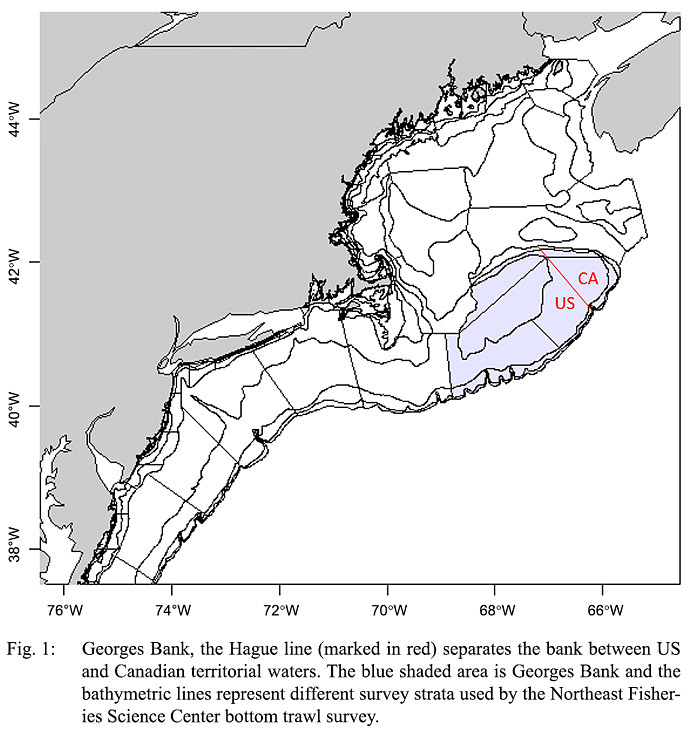 Georges Bank is a shallow plateau (40 000 km2) located off the coast of New England, separated to the north and south by deep channels (Fig. 1). The Bank has been subject to many environmental fluctuations that are predicted to continue into the future (Fogarty and Murawski, 1998; Wainwright et al., 1993; Mountain and Kane, 2010). This region is characterized by high productivity that has supported fisheries for centuries (Fogarty and Murawski, 1998). The yellowtail flounder fishery on Georges Bank started in the 1930s and was considered one of the principal groundfish stocks. Fisheries targeted primarily cod, haddock and yellowtail flounder on the Bank and the area was open to international fishing until 1977. However, by the 1990s overfishing had led to the collapse of the industry (Fogarty and Murawski, 1998; Stone et al., 2004).