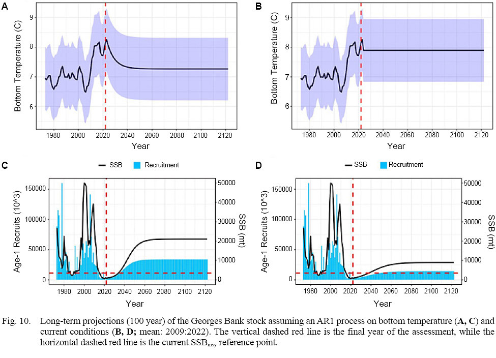 New long-term projections from this study suggest that the Georges Bank yellowtail flounder stock can increase again in the future. The rate and extent of increase will be based on biology, fishing mortality and bottom temperature. Based on the current assessment, colder bottom temperatures will allow the stock to increase faster and support larger stock sizes. More work is needed on how to treat bottom water temperature in the projection period. Especially since short term projections are often used to inform fisheries management. For example, it is probably not appropriate to assume the most recent conditions (2009–2022) will hold in the future. Additionally, the autocorrelated temperature projection allows the first several years in the projection period to be correlated with terminal year estimates of bottom temperature. This might be appropriate for short-term projections, but over the long-term bottom temperature reverts back to the mean of the entire time series. For long term predictions, neither approach is realistic given the dynamic nature of Georges Bank and predictions of future ocean conditions (Wallace et al., 2018; Cheng et al., 2022). WHAM can fit to future estimates of a covariate in the projection period, but this information is not available for the bottom temperature time series used in the assessment (Du Pontavice et al., 2023). Thus, future work should explore using climate projections in the stock assessment projection period.