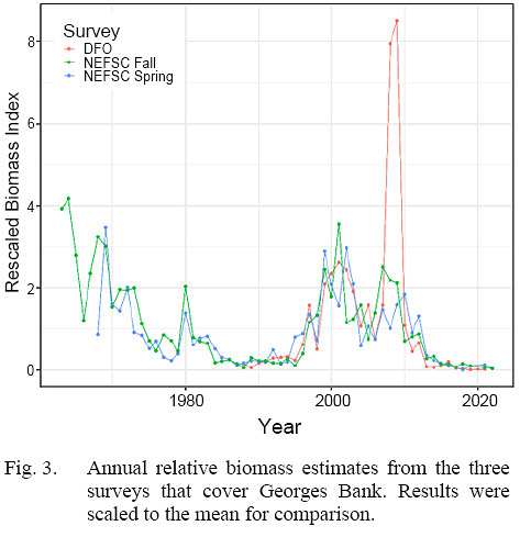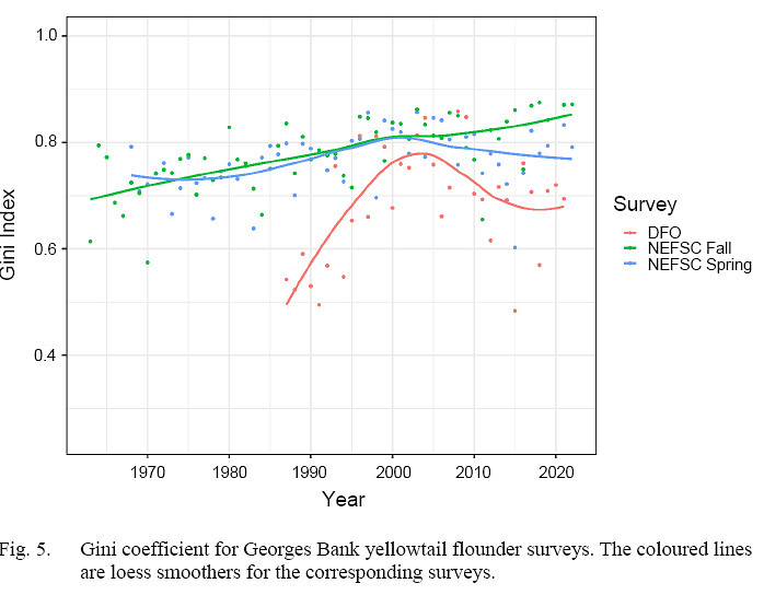 Fisheries surveys are a common tool to explore spatial distributions of marine fishes because they have consistent spatio-temporal sampling. Three fisheries independent surveys cover the entire Georges Bank stock area: Fisheries and Oceans Canada winter survey (DFO, since 1987), and the Northeast Fisheries Science Center (NEFSC) spring and fall surveys (since 1968 and 1963, respectively). All three surveys are based on a stratified random design. The same stratified-mean indices of relative abundance that are derived for stock assessment were used to explore trends in relative abundance. Maps were created to explore visual changes in spatial use. A Gini index (Woillez et al., 2007) was used to measure the spatial distribution for the three different surveys. The Gini index provides a measure of spatial aggregation, with lower values indicate wider distribution and higher values indicate higher concentrations. A Gini index does not provide fine scale measurements of changes in center of gravity or effective area occupied. A loess smoother was fit to the Gini coefficients from each survey to inform long-term trends. The analyses conducted here use a terminal year of 2022, which is the last year in the most recent stock assessment.
