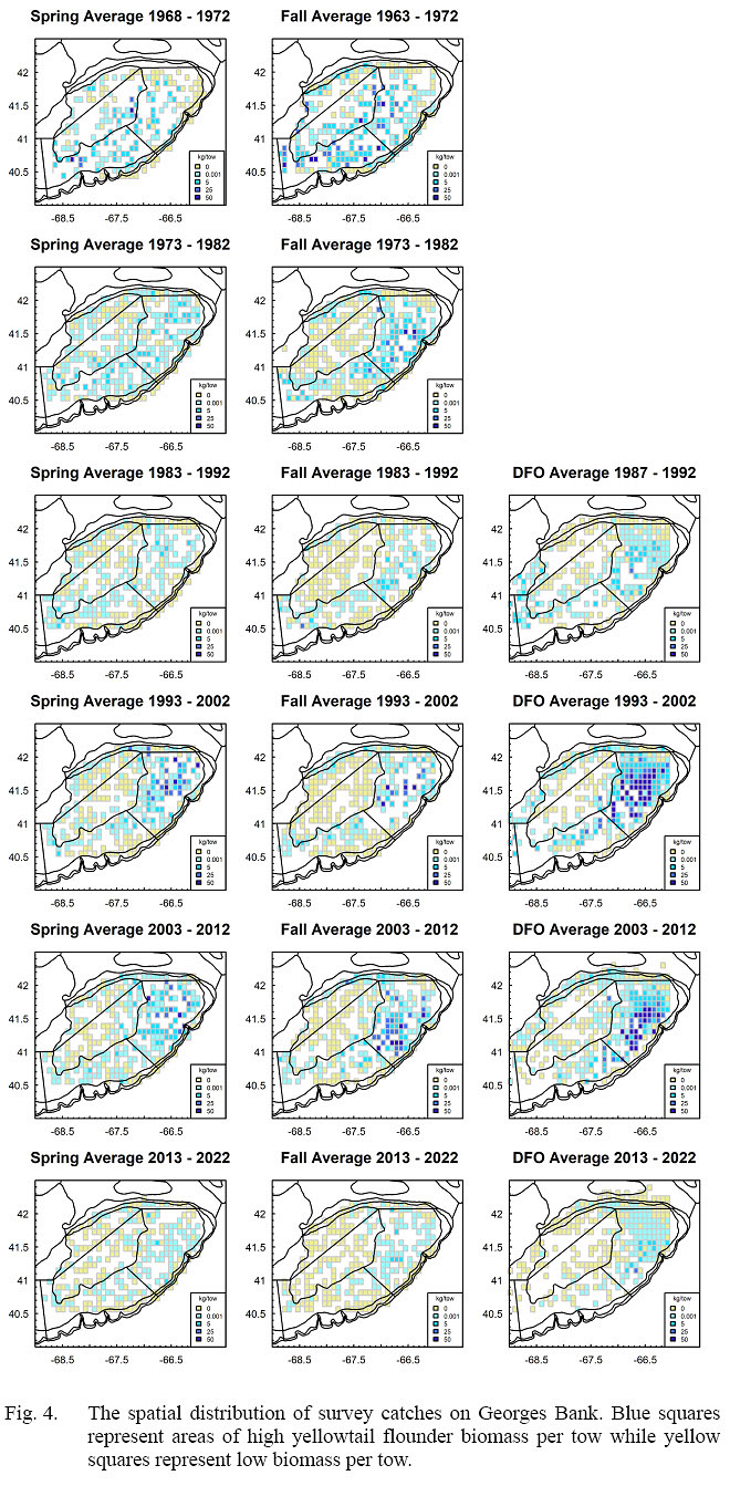 A common theory in ecology is that population abundance is positively correlated with spatial range (MacCall, 1990; Holt et al., 1997). As a population decreases, it can contract to preferred habitat (Shackell et al., 2005). Spatial contractions can make it easier for fisheries to target a resource and can violate a common assumption that catch rates are proportional to abundance. Catch rates can stay high or stable in the concentrated areas while population abundance declines (Erisman et al., 2011). Fish can also shift their distribution in response to changing ocean conditions (Nye et al., 2009; Pinsky et al., 2013). We conducted new analyses of the spatial distribution of yellowtail flounder using fisheries independent surveys to examine if spatial distribution changed.