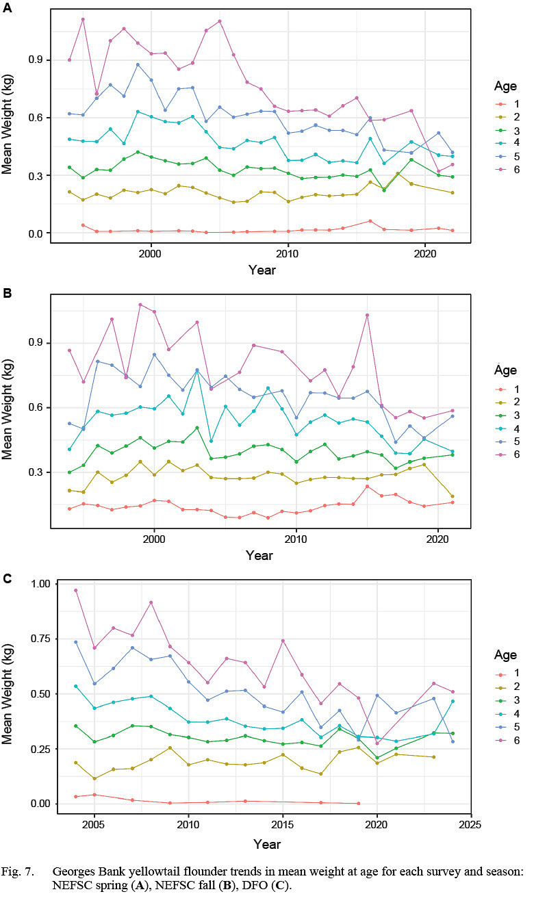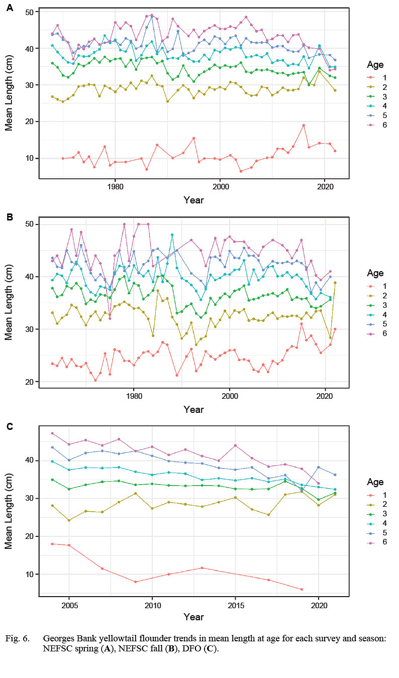 Size and growth information are important for understanding the population dynamics of a stock and can be used as empirical indicators to inform fisheries management. For example, a lack of smaller fish can indicate reduced recruitment. In contrast, fewer larger fish may indicate slower growth, or higher natural or fishing mortality (Miranda et al., 2024). Empirical length and age data are available for the entire time series for both the NEFSC spring and fall surveys. However, individual weights were not collected on the NEFSC surveys until 1995. Empirical age data is available from the DFO survey since 2004. We produced new analyses of trends in size and growth. These analyses focus on ages one through six, because few fish older than age six were caught in the fisheries and surveys. The stock assessment aggregates these ages into an age-6+ group (NEFSC, 2024). Analyses focused on trends in mean length and mean weight to understand temporal trends in growth. These inputs are commonly used in stock assessment and provide indications about changes in growth.