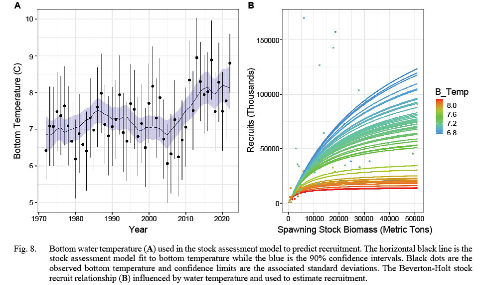 Temperature can impact multiple aspects of recruitment including timing, egg viability, food availability, larval growth and mortality (Takade-Heumacher et. al., 2014). It is unclear what the specific mechanism is for Georges Bank yellowtail flounder. However, it has long been hypothesized that warm temperatures could lead to reduced recruitment (Royce et al., 1959; Lux, 1964; Lux and Nichy, 1969). Previous research, has linked recruitment deviations to water temperature for yellowtail founder on Georges Bank (Brodziak and OʼBrien, 2005; Takade-Heumacher et al., 2014) and the adjacent stock in southern New England (Sissenwine, 1974, 1977; Sullivan et al., 2005).